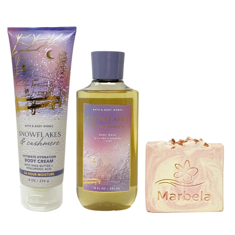 - Bath & Body Works Snowflakes & Cashmere Body Cream and Body Wash Bundle with a Himalayan Salts Springs Bar Soap. (Soap May Vary).