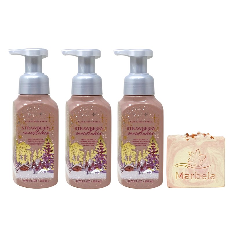 Bath & Body Works Strawberry Snowflakes Gentle Foaming Hand Soap Bundle with a Marbela Himalayan Salts Springs Bar Soap. INCLUDES: 3 Gentle Foaming Hand Soaps (8.75 fl oz / 259 mL each) and a Marbela Himalayan Salts Springs Bar Soap. Strawberry Snowflakes - What it smells like: a fluffy, fruity flurry. Fragrance notes: juicy strawberry, whipped cream and iced bergamot. Marbela Himalayan Salts Springs Soap - Himalayan salts help hydrate and nourish the skin, with its water absorbent properties. These minerals are known to be helpful for acne, irritated and dry skin. Himalayan Salt Springs soap has natural kaolin clay blended to further moisturize and hydrate your body. Scent: Citrusy Florals with Litsea Cubeba Essential Oil.