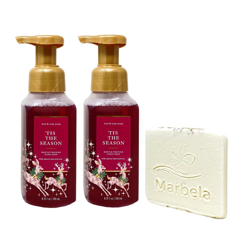 Bath & Body Works 'Tis The Season Gentle Foaming Hand Soap Bundle with a Marbela Natural Oats Sample Soap. INCLUDES: 2 Gentle Foaming Hand Soaps (8.75 fl oz / 259 mL each) with a Marbela Natural Oats Sample Soap (Soap May Vary). 'Tis The Season - What it smells like: fruity, woodsy and spiced—the spirit of the season. Fragrance notes: rich red apple, sweet cinnamon and cedarwood. What it does: washes away dirt and helps maintain skin's natural moisture barrier. Marbela Sample Soap - While ordinary soaps dry out your skin, Marbela specializes in all-natural, moisturizing soaps and bath products that will take your self-care routine to the next level. The priority is to create products that are all-natural, vegan, cruelty-free and most importantly, handmade with love.