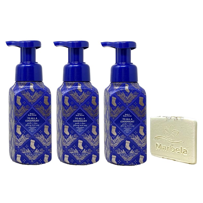 - Bath & Body Works To All A Good Night Gentle & Clean Foaming Hand Soap Bundle with a Marbela Natural Oats Sample Soap. (Soap May Vary).