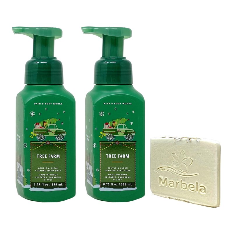 - Bath & Body Works Tree Farm Gentle & Clean Foaming Hand Soap Bundle with a Marbela Natural Oats Sample Soap. (Soap May Vary).