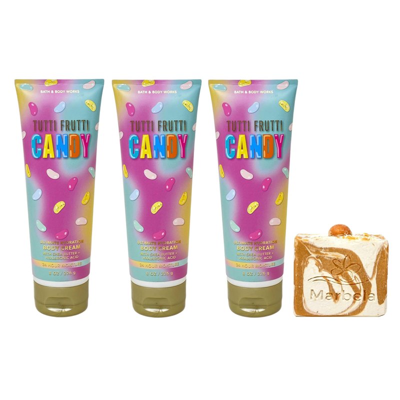 Bath & Body Works Tutti Frutti Candy Body Cream Set with a Marbela Peach Gardenia Bar Soap. INCLUDES: 3 Ultimate Hydration Body Creams (8 oz / 226 g each) and a 4 oz Marbela Peach Gardenia Bar Soap. Tutti Frutti Candy - What it smells like: a sweet and fruity Easter basket surprise. Fragrance notes: sweet jelly beans, mixed berries and sugared lemon. Marbela Peach Gardenia Bar Soap - We cannot get enough of this delicious soap made with peaches and gardenia for the most soothing aromatherapy. Like all of our soaps, you can expect ultra moisturizing benefits from our natural soaps and butters. Scent: Floral Sweetness.