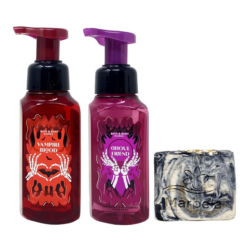 Bath & Body Works 2 Piece Gentle & Clean Foaming Hand Soap Bundle with a Marbela Charcoal Scrub Bar Soap. INCLUDES: 2 Gentle & Clean Foaming Hand Soaps in Vampire Blood and Ghoul Friend (8.75 fl oz / 259 mL each) and a 4 oz Marbela Charcoal Scrub Bar Soap. Vampire Blood - What it smells like: equal parts fruity, floral and frightful. Fragrance notes: red berries, night-blooming jasmine and petrifying plum. What it does: washes away dirt and helps maintain skin's natural moisture barrier. Ghoul Friend - What it smells like: bright, fruity and simply fa-boo-lous. Fragrance notes: dark strawberries, ghostly peony, spine-chilling citrus. What it does: washes away dirt and helps maintain skin's natural moisture barrier. Marbela Charcoal Scrub Soap - Combine activated charcoal, fresh coffee grounds, and oats for three powerful natural exfoliants. The fine grains throughout the soap in combination with its lack of fragrance exfoliate even the most sensitive skins.In addition, the blended clay and butters of the soap moisturize and soften making the ingredients the perfect duo. Scent: This soap is UNSCENTED in order to be sensitive skin friendly.
