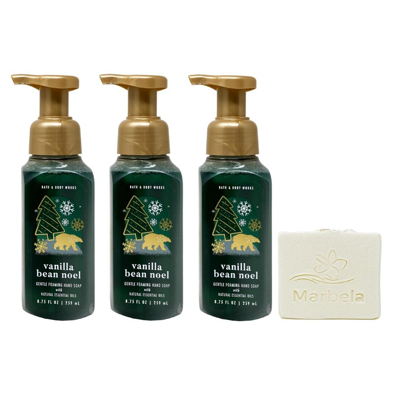 Bath & Body Works Vanilla Bean Noel Foaming Hand Soap Bundle with a Marbela Natural Oats Bar Soap. INCLUDES: 3 Gentle Foaming Hand Soaps (8.75 fl oz / 259 mL each) and a 4 oz Marbela Natural Oats Bar Soap. Vanilla Bean Noel - What it smells like: warm, fresh-baked holiday treats. Fragrance notes: fresh vanilla bean, warm caramel, sugar cookies, whipped cream and snow-kissed musk. Marbela Natural Oats Soap - Natural Oats is our most gentle formula for any skin type! Oats help to cleanse, exfoliate and soothe irritation. In addition, the sweet almond oil leaves skin soft and pampered. This soap was made for people with sensitive skin because we realize what a battle that can be. Notes of: This soap is UNSCENTED in order to be sensitive skin friendly.