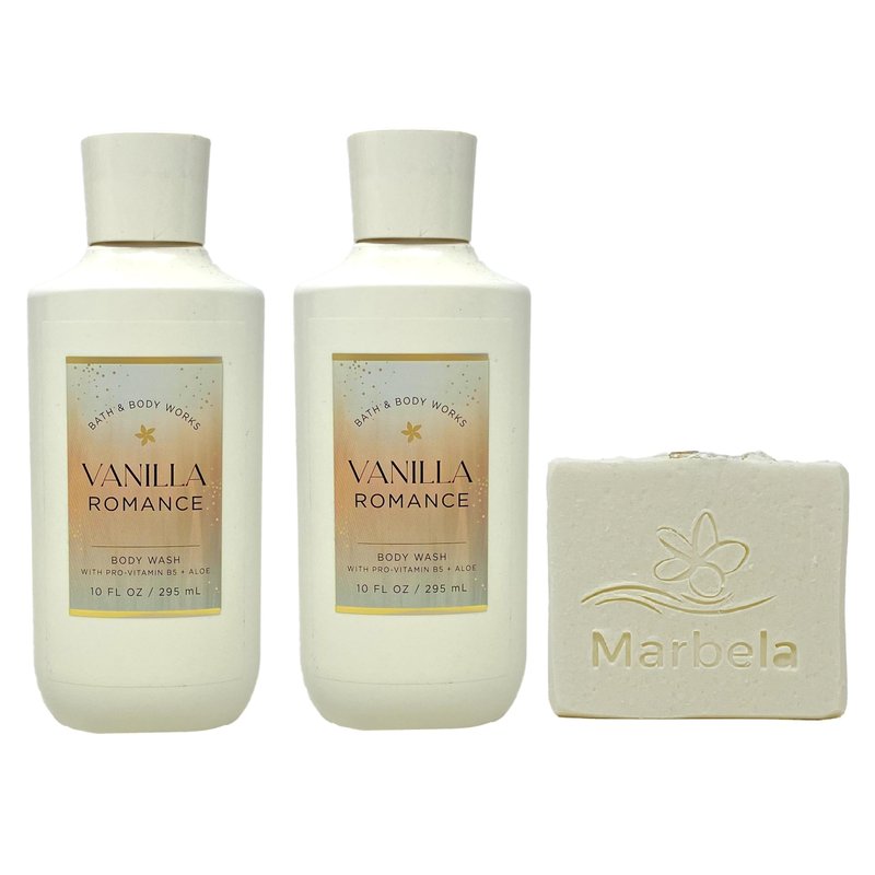 - Bath & Body Works Vanilla Romancer Body Wash Bundle with a 4 oz Marbela Natural Oats Bar Soap. (Soap May Vary).