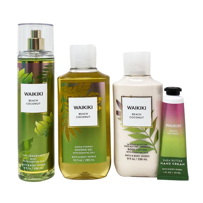 - Bath & Body Works Waikiki Beach Coconut 4 Piece Gift Bag Set with a Marbela Bar Soap (Soap May Vary).