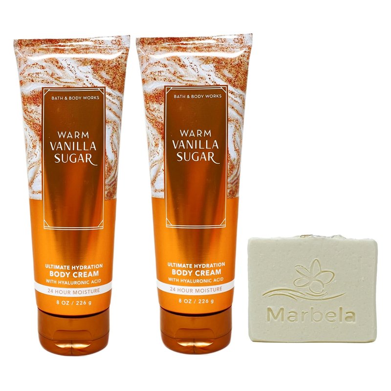 - Bath & Body Works Warm Vanilla Sugar Body Cream Gift Set with a 4 oz Marbela Natural Oats Bar Soap. (Soap May Vary).