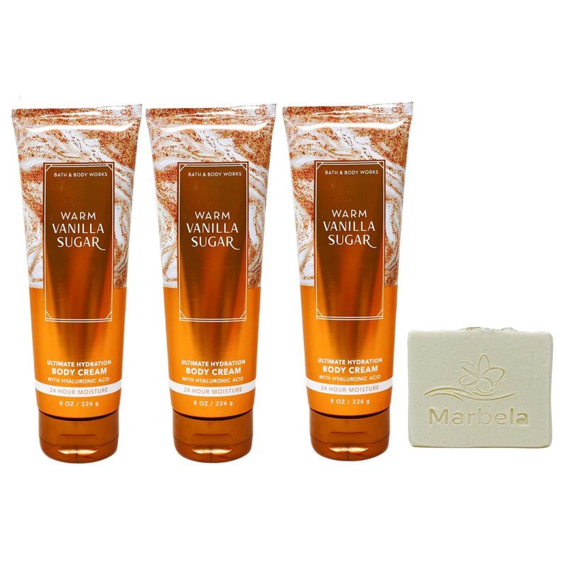 - Bath & Body Works Warm Vanilla Sugar Body Cream Gift Set with a 4 oz Marbela Natural Oats Bar Soap. (Soap May Vary).