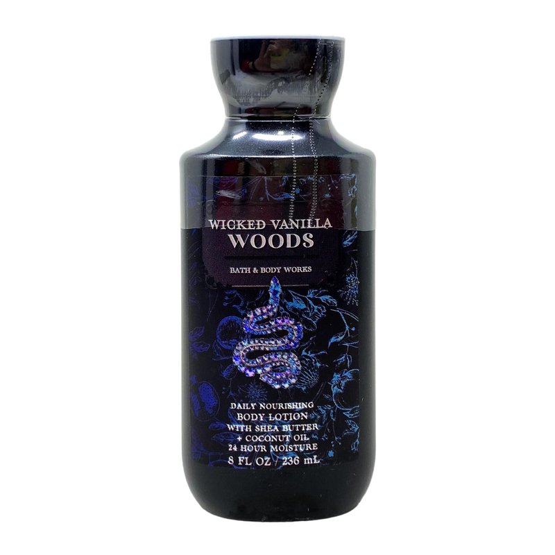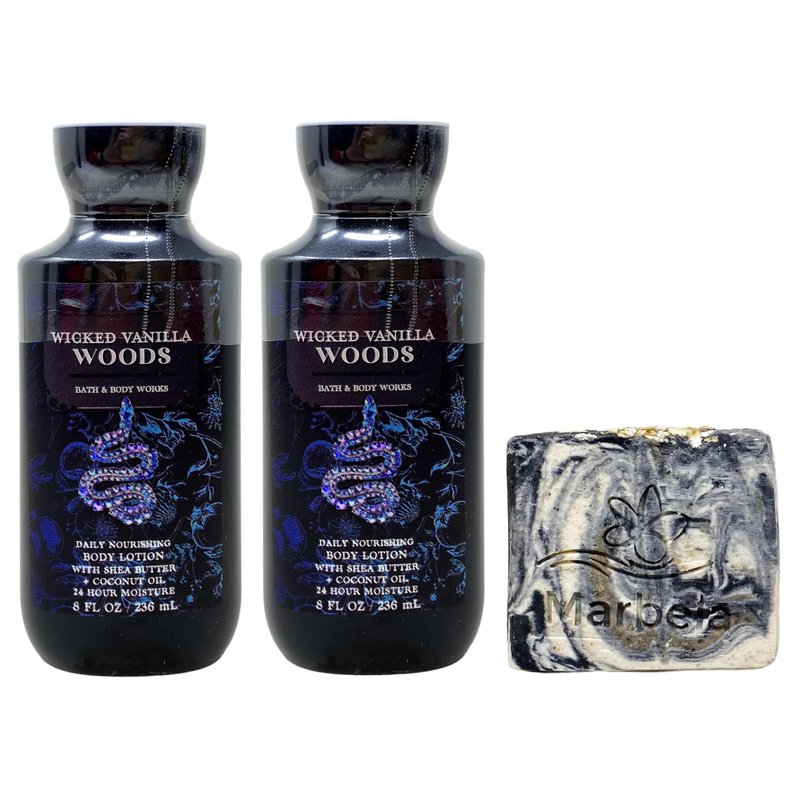 - Bath & Body Works Wicked Vanilla Woods Daily Nourishing Body Lotion Gift Set with a 4 oz Marbela Charcoal Scrub Bar Soap. (Soap May Vary).