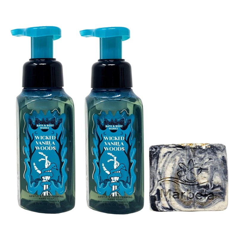 Bath & Body Works Wicked Vanilla Woods Gentle & Clean Foaming Hand Soap Bundle with a Marbela Charcoal Scrub Bar Soap. INCLUDES: 2 Gentle & Clean Foaming Hand Soaps (8.75 fl oz / 259 mL each) and a 4 oz Marbela Charcoal Scrub Bar Soap. Wicked Vanilla Woods - What it smells like: walking through a haunted forest on a sweet, spooky night. Fragrance notes: magical vanilla, glowing amberwood and enchanted pink pepper. What it does: washes away dirt and helps maintain skin's natural moisture barrier. Marbela Charcoal Scrub Soap - Combine activated charcoal, fresh coffee grounds, and oats for three powerful natural exfoliants. The fine grains throughout the soap in combination with its lack of fragrance exfoliate even the most sensitive skins.In addition, the blended clay and butters of the soap moisturize and soften making the ingredients the perfect duo. Scent: This soap is UNSCENTED in order to be sensitive skin friendly.