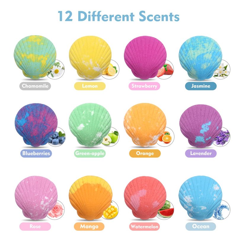- 【12 COLORFUL KIDS BATH BOMBS SET】Throw a kids bath bomb into the water and watch it hiss, creating magical colors. 12 pack amazing scent: Ocean, Blueberries, Mango, Green-apple, Orange, Lavender, Lemon, Strawberry, Chamomile, Rose, Jasmine, Watermelon.
