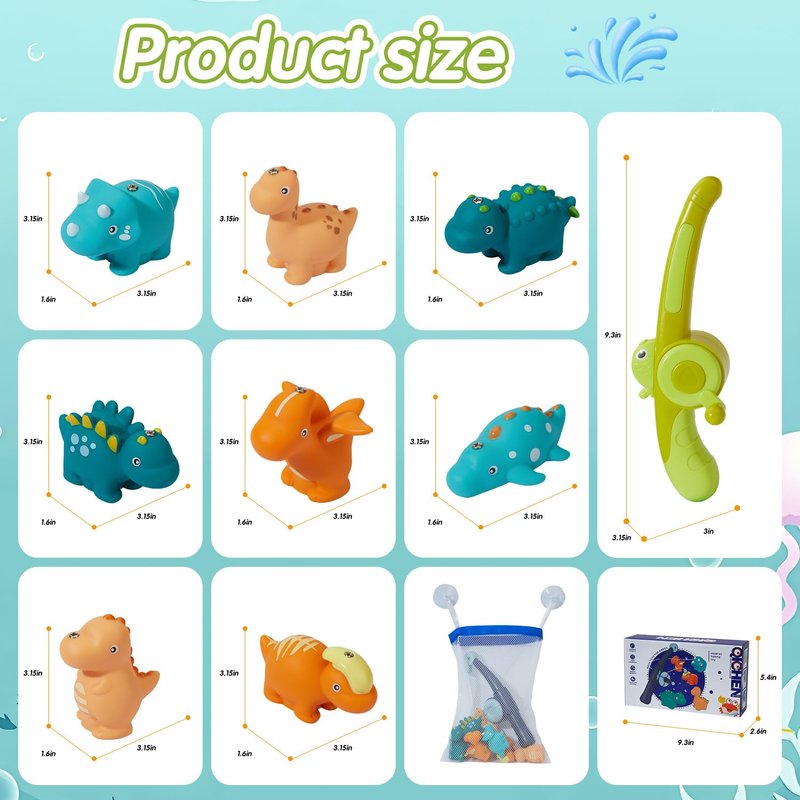 - Dinosaurs themed fishing toy set includes: toddler bath toy set contains 1 magnetic fishing rod and 8pcs magnetic Soft Rubber Dinosaurs floating toys,Characters float with magnets on top for easy fishing. Magnetic fishing hook easily picks up dinosaurs toys, and the handle is specially made to fit toddler hands.