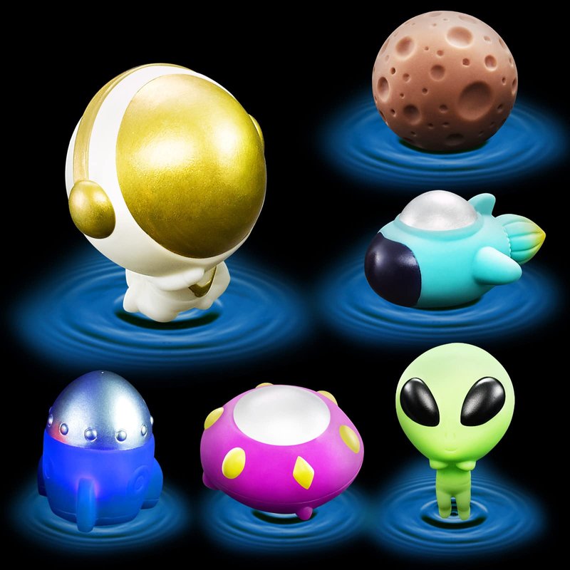 - 6 pieces pack of light-up bath toys featuring a space theme, including cute and funny astronaut, rocket ship, aliens, UFO, space ship and planet.