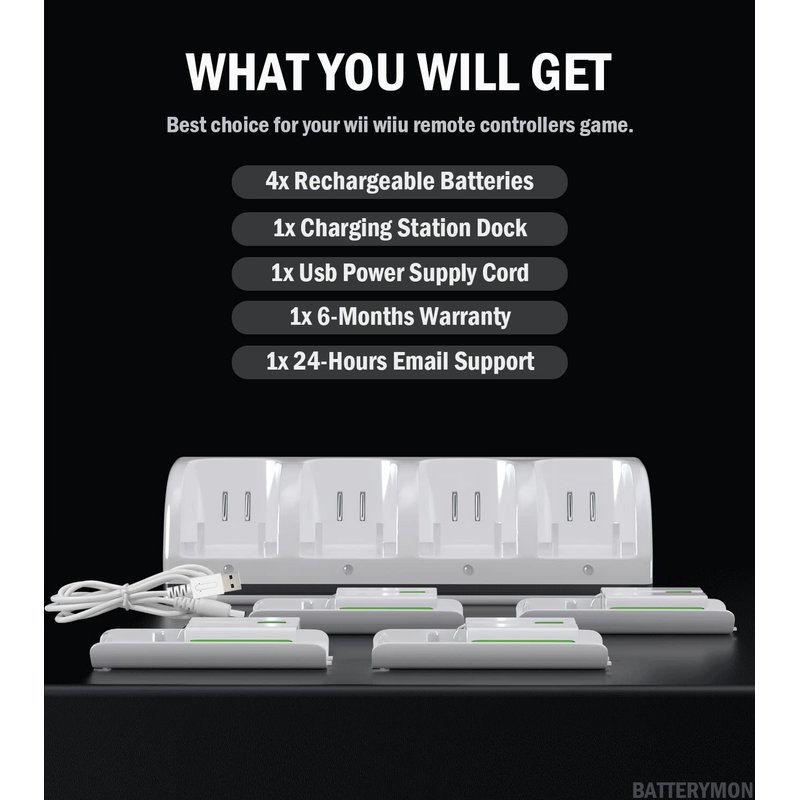 - 4-in-1 Charging Station: Allow you to charge 4 Wii / Wii Uremotes at the same time, and no need to remove the batteries. The USB port charging cable will be convenient for you to connect power.
