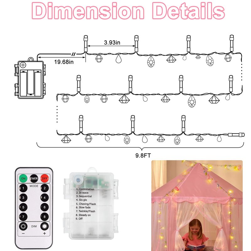 - 8 Modes LED Fairy String Lights: 9.8ft battery twinkle fairy lights with remote 8 lighting effects (combination, in wave, sequential, slo glo, chasing/flash, slow fade, twinkle/flash, and steady on.) You can choose different twinkling modes according to your environmental needs, adding unique colors to your ambient atmosphere.