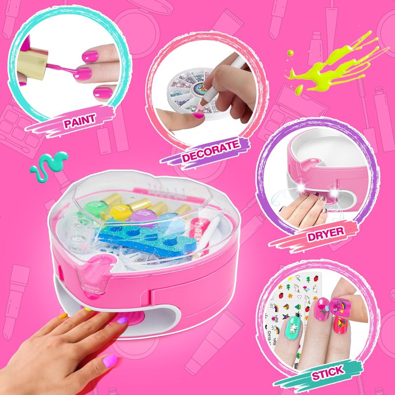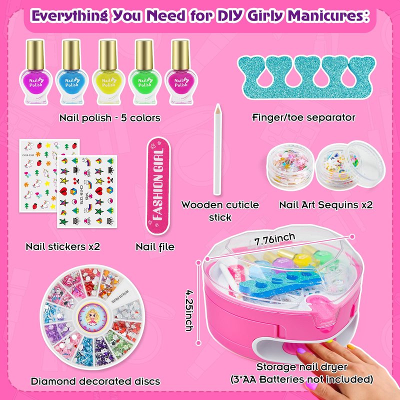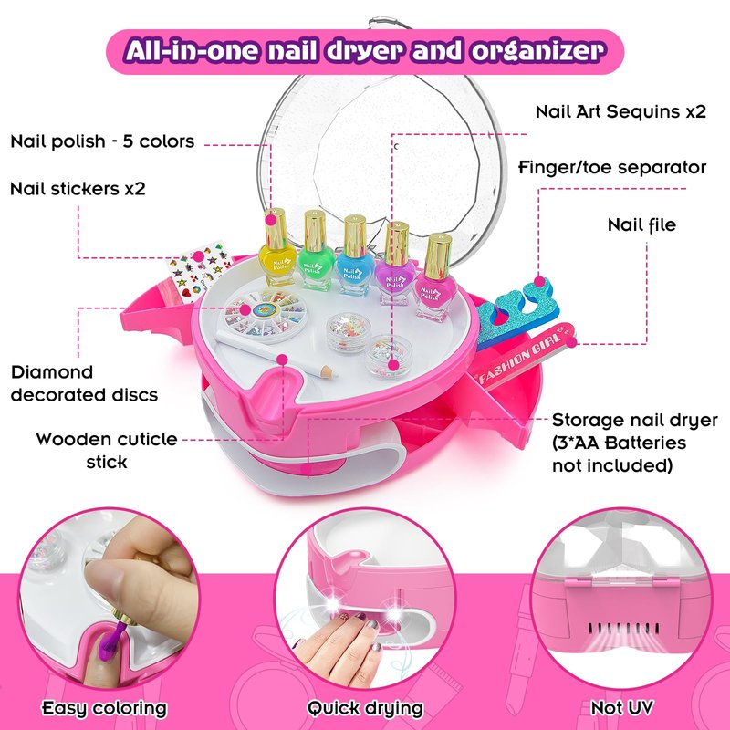 - 【All-in-one Kids Nail Art Kit】This loving nail polish set for girls contains everything needed for a manicure - nail dryer with organizer, 5 colors kids nail polish, 2 pcs nail stickers, 12 style gems, nail file and separator. The integrated storage and drying design can make the girls' nail studio more vivid and realistic. It's perfect for girl's parties, family gatherings, and parent-child time, all little girl loves it.