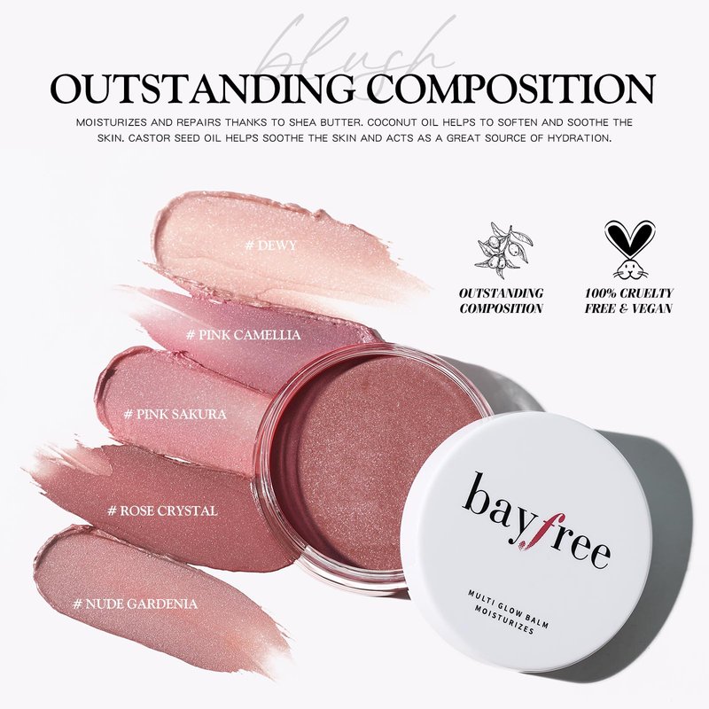 A tinted face glow balm with a smooth & moisturizing texture that wide range of uses and easy to apply. Cream blush balm can be used on cheeks, lips or any areas that need to tint or highlighted for an instant refresh. Available in a choice of five colors to suit any skin tone and occasion. Tips: bayfree cream blush focus on creating a hydrated, dewy effect, so this blush is a lighter colour than normal blushes. If you want both shine and colour, you can layer it with a darker shade. Our blush is buildable.