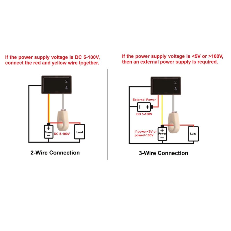 - Dual display: Display Voltage and (+ -) Current at the same time; Power supply: DC 5~100V; Voltage test range: 0~300V; Current test range: ±0~100A