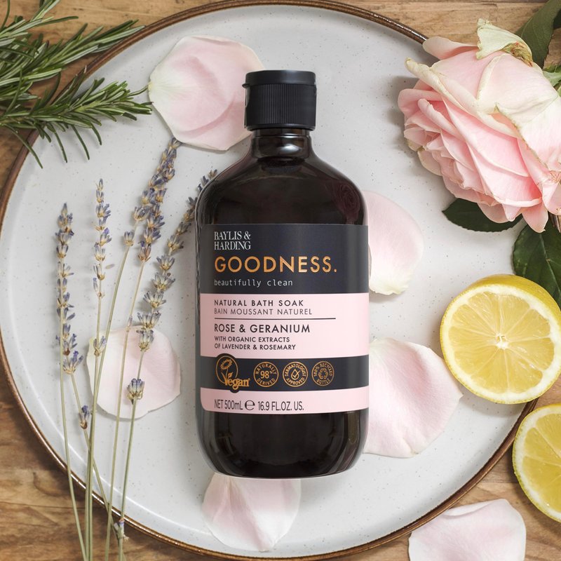 Baylis & Harding Goodness Body Wash, Rose & Geranium Scent. Natural Body Wash & Bath Soak Set, 98% Naturally Derived, Dermatologist Approved, Vegan.