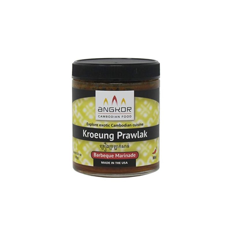 Kroeung Prawlak (គ្រឿងប្រឡាក់សាច់) is the flavor for the most popular street food BBQ in Cambodia. Traditionally, preparing Kroeung Prawlak is very time consuming, but we have perfected the recipe, so all you have to do is add some oil and marinate. It has a natural texture from the lemongrass, deep rich flavor from the tamarind, a touch of sweetness and sour undertones, and an earthy aroma. One jar Marinates 2.5 pounds of beef or chicken. Ingredients: Lemongrass, Avocado oil, Cane Sugar, Beef Flavor (beef stock, maltodextrin, salt, sugar, yeast extract, onion powder, natural flavor, beef extract, beef fat), Garlic, Onion, Sea Salt, Spice (including turmeric), Tamarind, Chile Peppers