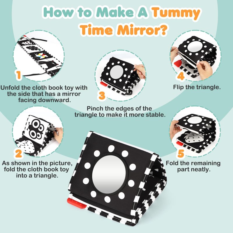 - Ideal Toy for Tummy Time: You can also put these baby books on the floor for the tummy time. The high contrast patterns and the baby mirror can attract the baby's attention for a long time, which could improve their fine motor skills, prevent flat head and help strengthen baby's leg and arm muscles. Babies will enjoying touching and flipping thses soft books, making tummy time fun.