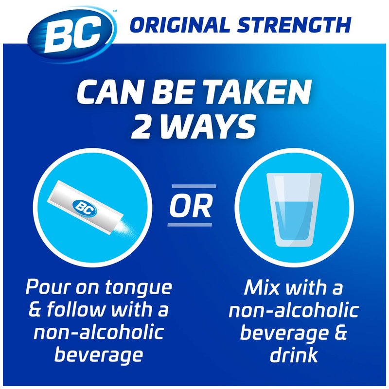- BC Powder Original Strength Pain Reliever temporarily relieves headaches, backaches, toothaches, muscle aches and menstrual cramps