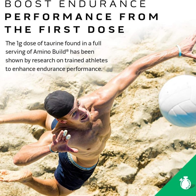 - BOOST ENDURANCE – The 1g dose of taurine found in a scoop of Amino Build has been shown by research on trained athletes to enhance endurance performance. Give your muscles the fuel they need to perform with Amino Build