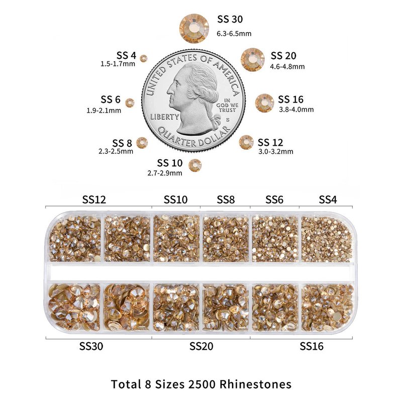 - Wide range of sizes: This Nail Art Rhinestone kit includs 8 Sizes 2500 pieces gold nail rhinestones, which coverd all regular sizes: SS4,SS6,SS8,SS10,SS12,SS16,SS20 and SS30 ,and enough for most projects.
