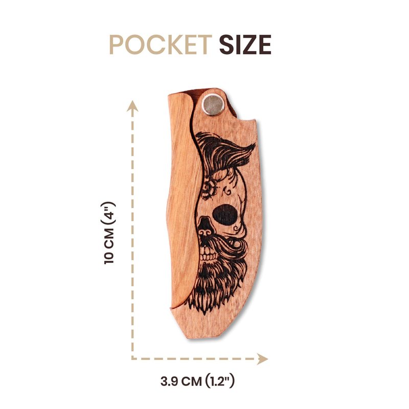 Beard Comb for Men Pocket Folding Combs for Mustache & Hair Travel Natural Wooden Comb with Real Man Engraving - Perfect for Use w/Beard Balm Oil (Wavy Half Skull) (Model WV)