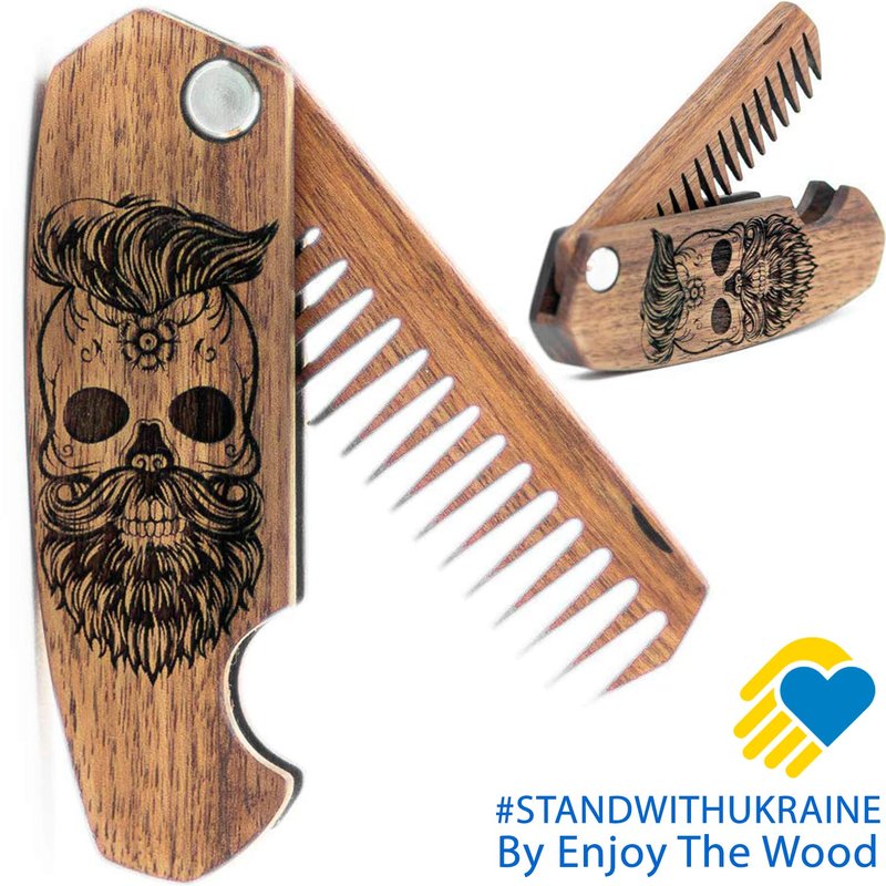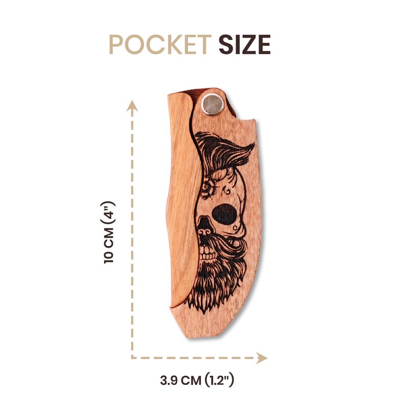 Beard Comb for Men - Pocket Folding Combs for Mustache & Hair Travel Natural Wooden Comb with Skull Engraving - Perfect for Use w/Beard Balm Oil