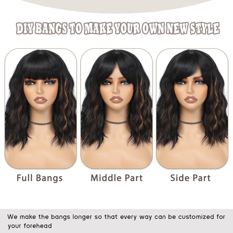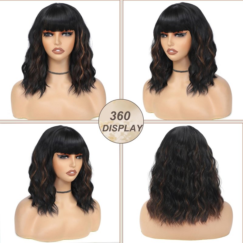 BEAUTIFA Black Mix Brown Wig with Bangs for Women 14 Inch Shoulder Length Short Bob Wavy Curly Wig Black Mix Brown Wig Heat Resistant Synthetic Wigs