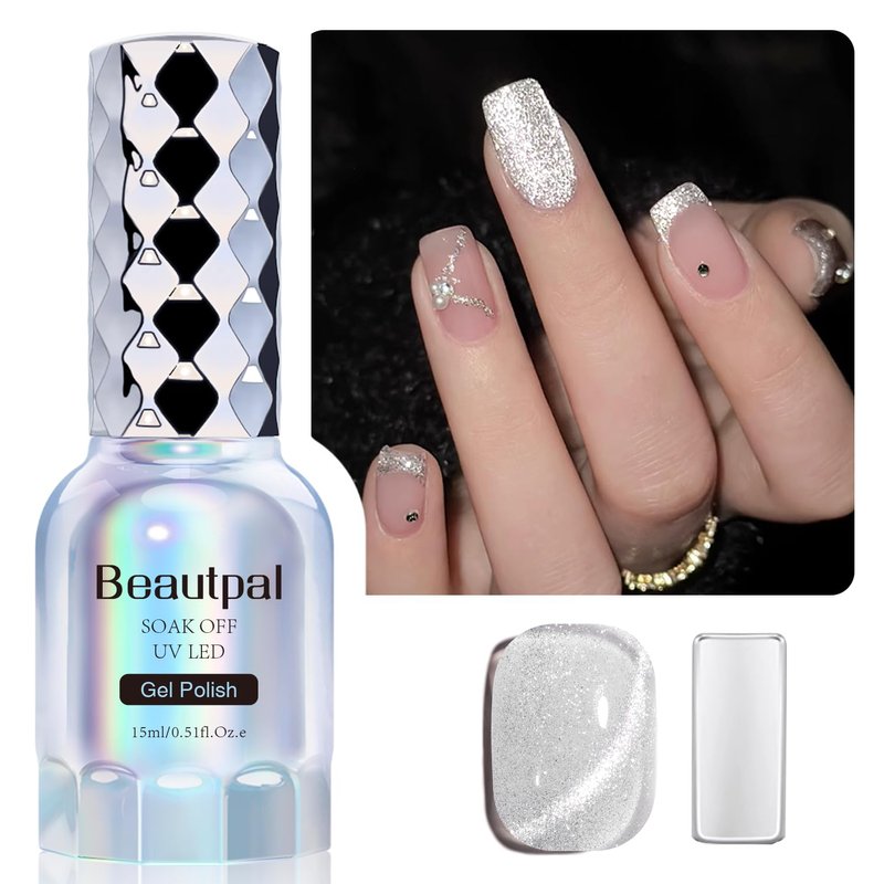 BEAUTPAL Platinum Cat Eye Gel Nail Polish, Silver Sparkly Shine Cat Eye Soak Off UV LED Nail Polish Gel Salon Manicure Nail Art DIY at Home 15ML(0.51FL OZ) with Magnetic Stick