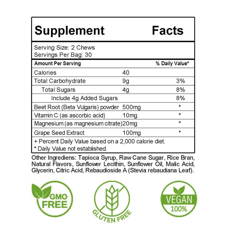 - Plant-Based: Nitric oxide generation may be supported by the clinically researched polyphenols in Mega Beets Heart Chews, a plant-based, non-GMO, and caffeine-free product. By assisting in the preservation of nitric oxide levels, promote blood pressure and good circulation. Each chew's exclusive grape seed extract may also aid in preventing free radicals from destroying nitric oxide.