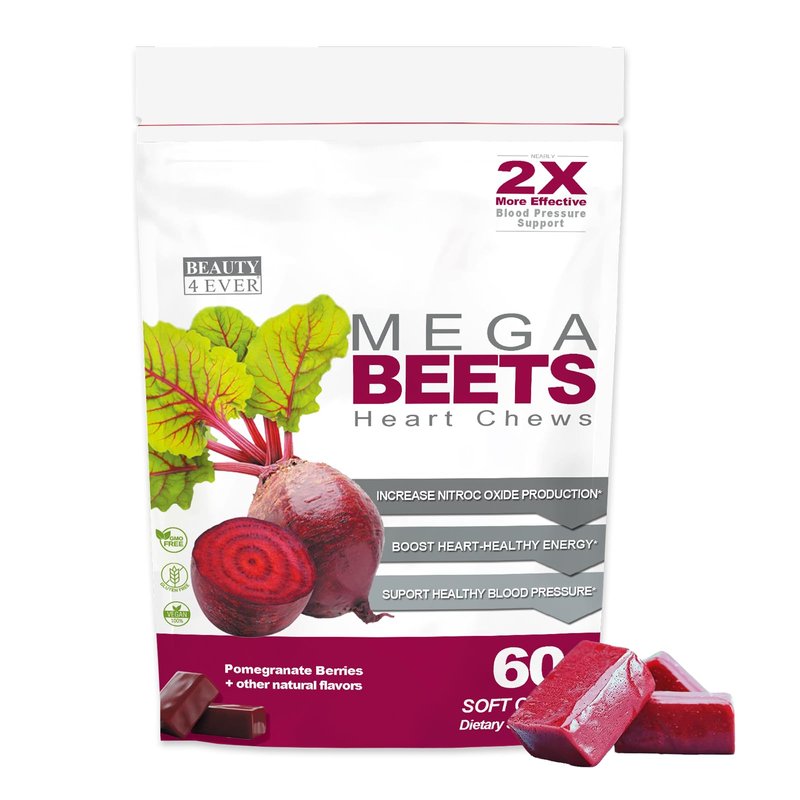 - Mega Beets Heart Chews are a tasty and entertaining portable snack that come in individual wrapping, making them the ideal choice for on-the-go consumption. Without any artificial sweeteners, these soft chews feature a naturally occurring pomegranate berry flavor. There are 60 chews overall in each bag (30 servings).