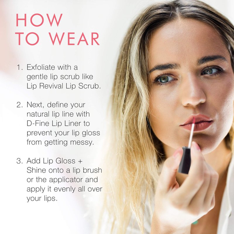 - PLUMPING LIP GLOSS - Lip Gloss + Shine is a high shine, non-sticky, naturally plumping gloss available in ten shades: D-Light, Dream On, Kiss Me, Lighthearted, Light My Fire, Nudist, Orange Rush, Rebel Rebel, Starlust & Turned On.