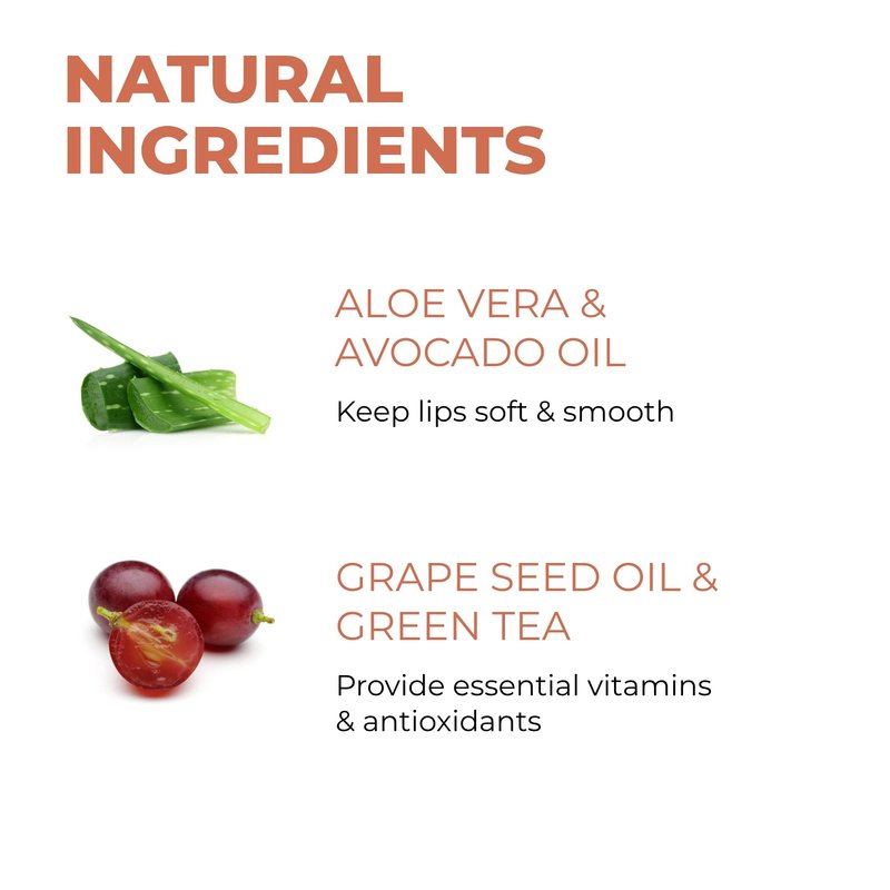 - NATURAL INGREDIENTS - Aloe vera & avocado oil keep your lips soft and smooth, while grape seed oil & green tea extract provide essential vitamins and antioxidants to keep them protected and nourished.