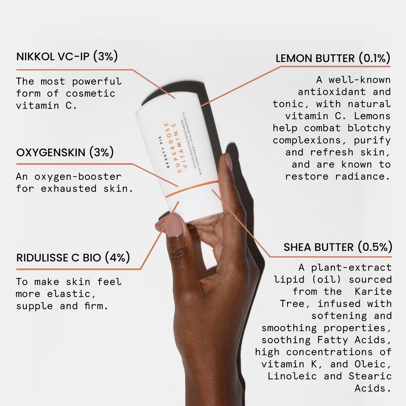 - Exceptional Ingredients: NIKKOL VC-IP (3%) - The most powerful form of cosmetic vitamin C. OXYGENSKIN (3%) - An oxygen-booster for exhausted skin. RIDULISSE C BIO (4%) - To make skin feel more elastic, supple and firm. Helps prevent hyperpigmentation, calms skin. LEMON BUTTER (0.1%) - A well-known antioxidant and tonic, with natural vitamin C. SHEA BUTTER (0.5%) - Infused with softening and smoothing properties.