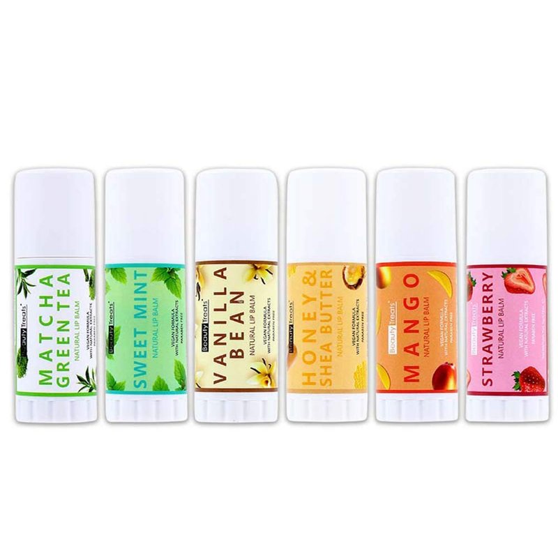 Beauty Treats Natural Lip Balm Model 610 6 Ct Honey & Shea Butter, Sweet Mint, Mango, Vanilla Bean, Matcha Green Tea, Strawberry