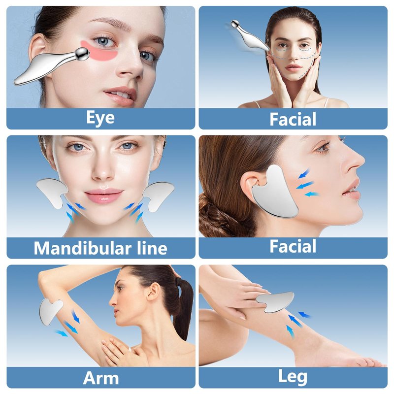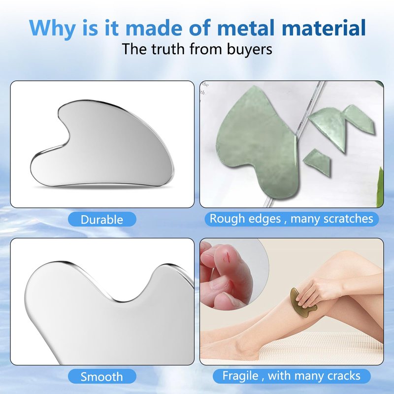 - 【Quality material】Our gua sha tool is made of quality stainless steel material,which is an upgrade to the traditional gua sha stone.polished to the mirror surface,smoother,cleaner,and more sustainable.The facial massage tool is nice for facial SPA, the smooth edges of scraper ensure gently touching your skin without hurting while massaging your face accurately