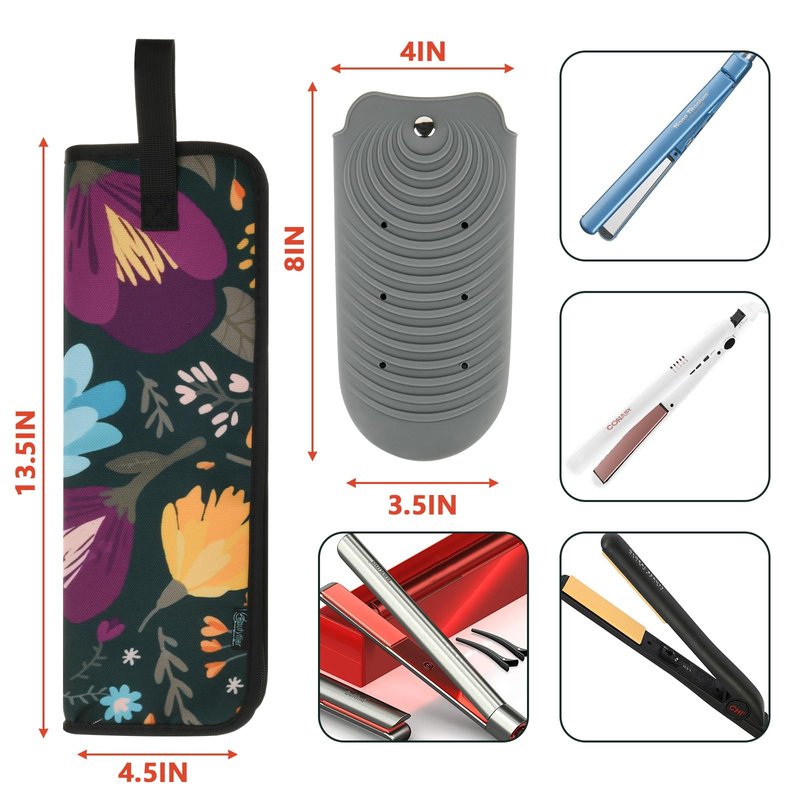 - Package: 1pc canvas hair flat iron organizer bag + 1pc heat resistant silicone cover/mat. It is made of durable canvas fabric lined with neoprene material, printed flower pattern; portable, washable and heat resistant.
