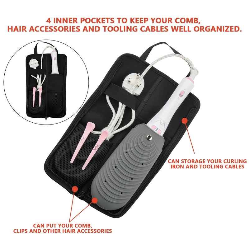 - This curling iron holder is designed to fit most size of hair styling tools, 4 inner pockets to keep your comb, hair accessories and tooling cables well organized.