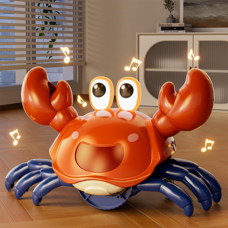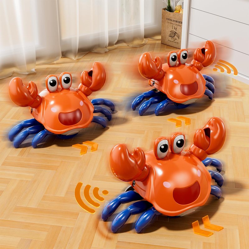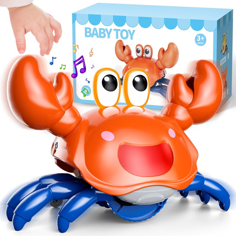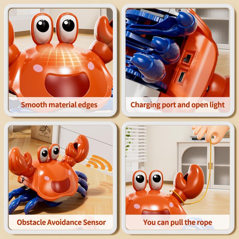 - Crawling Crab Baby Toy: It moving fast, skitters sideways like a real crab, and plays fun sounds and music and lights up. When it approaches an obstacle, its sensors reverse direction. Rechargeable and long-lasting: This crawling crab baby toy is equipped with a USB charging port, making it rechargeable and designed specifically for endless fun. Your baby can enjoy hours upon hours of entertainment.