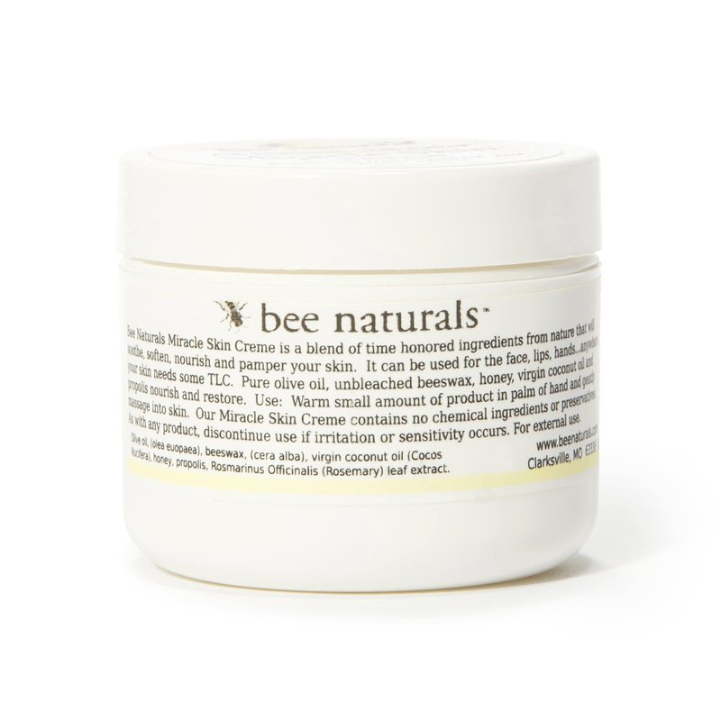 Experience the transformative power of Bee Naturals Miracle Skin Creme a luxurious all-natural hydrating cream crafted with nature's finest ingredients This 4-ounce jar is packed with pure olive oil beeswax virgin coconut oil honey and propolis Each ingredient is carefully selected for its nourishing and soothing properties to revitalize your skin Our unique formula is free from harsh chemicals preservatives fragrances and parabens ensuring gentle care for even the most sensitive skin This versatile cream is perfect for moisturizing your face body hands and lips leaving your skin feeling soft smooth and hydrated Bee Naturals Miracle Skin Creme is trusted by generations worldwide for its effectiveness and natural approach to skincare Experience the difference today and discover naturally radiant skin The rich texture of the cream absorbs readily providing deep hydration without a heavy or greasy feel Whether battling dry skin chapped lips or simply seeking daily nourishment this cream is your go-to solution Bee Naturals is committed to using only the finest natural ingredients to produce high quality effective and safe skincare products Our commitment to quality and customer satisfaction makes Bee Naturals a trusted choice Experience the difference of using a natural skincare product that works Order your jar of Bee Naturals Miracle Skin Creme today and begin your journey to healthy radiant skin This product is suitable for all skin types including sensitive skin Its unscented formulation ensures gentle application suitable for daily use Bee Naturals Miracle Skin Creme a timeless solution for healthy and glowing skin