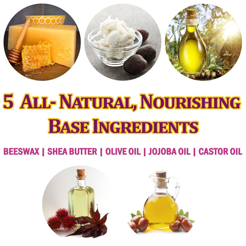 - All-Natural Ingredients: We use only the finest nature has to offer, with no harsh chemicals or artificial additives. Base ingredients: Beeswax, Shea Butter, Olive Oil, Jojoba Oil, Castor Oil; Essential Oils: Peppermint, Eucalyptus, Tea Tree, Turmeric, Lavender, Orange, Spearmint, Clove, Wintergreen, Lemongrass, Roman Chamomile, Fraser Fir, Frankincense, Nutmeg, Balsam Fir, Cinnamon, Cassia, Vanilla, Ginger, Thyme.