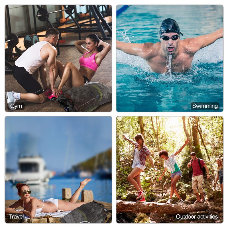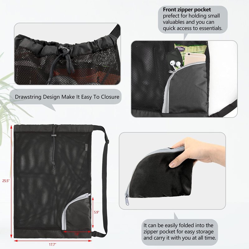 1.LARGE SIZE & STURDY:This sports drawstring backpack measures W 17.7"X L 25.5", which is big enough to carry all your soccer gear, sports gear,scuba gear bag,football gear,gym gear, swimming gear, beach gear,swim gear. All our swim bag is made of lightweight yet sturdy mesh material and reinforced with webbing tape, making it strong enough to pack heavy scuba gears, paddle board accessories. 2.FOLDABLE ZIPPER POCKECT & EASY TO CARRY: Extra zipper pockets of our mesh drawstring backpack make it easy for you to pack phones, keys. Besides,you can easily fold our mesh beach bag into the zipper front bag, which takes up hardly any space that can easily fit in a purse, pocket.You will always have a mesh swim bag with you whether you go to gym or beach trip.Our mesh drawstring bag is perfect for gym bag,swim bag,basketball bag,soccer bag,sports bag,beach gear bag. 3.BREATHE MESH CONSTRUCTIONS:The mesh gym bag Design keeps sand and water away for quick drying, allowing you to find what you need quickly. 4.WASHABLE& REUSABLE:Our large mesh swimming equipment bags with drawstring are machine washable and dry quickly, throw it in machine, save your time, free your hand. SUGGESTION: To extend the mesh drawstring cinch bag's service life, we recommend hand washes in cold water and air drying.