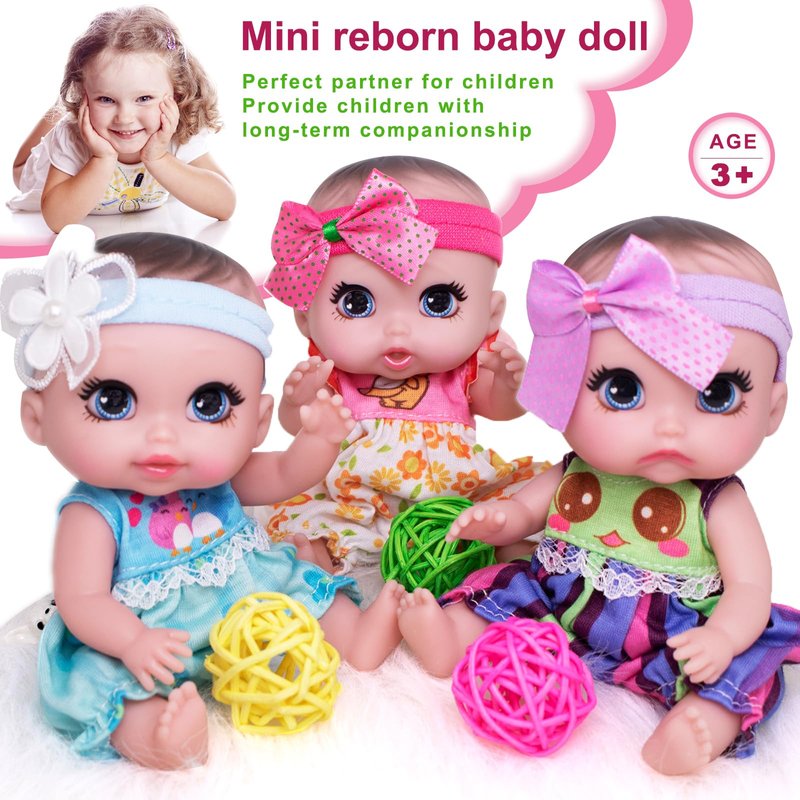 PACAGE: A cute 6-inch small baby doll packed in a zippered bag.Built in mysterious small accessories(Miniature Red Baby Bottle). baby doll toy will be soft in summerand hard in winter.So when the child takes a hot bath for the dollthe doll's body will become particularly soft, which is really fun. SIZE: About 16 cm for a swivel mini doll. Triplets. Cute expressionsare the main feature of small baby dolls. The size of the doll isonly the palm of an adult, so you can hold this realistic baby doll with one hand. MATERIAL: Full vinyl body, this material is environmentally friendly and non-toxic. Safety tested and approved for children 3 years and up. Baby doll toys will be soft in summer but hard in winter. So when a child takes a hot bath for the doll, the doll's body will become particularly soft, which is really fun. ADORABLE DECORATION: The reborn baby doll is a good choicedefinitely. lts color is very eye-catching. Not only as a birthday giftfor your child, you can put him in the car, on the table, next to theTV, or even in your own store. As a decoration, cute baby doll willdefinitely bring a lot of warmth to your family. BEST GlFT: These triplets with high quality acrylic 3D eyes pocketbabies are super cute and can be used as small gifts for friends,kids, daughters, girlfriends for their birthday, Halloween.Christmas, New year, Thanksgiving, etc.
