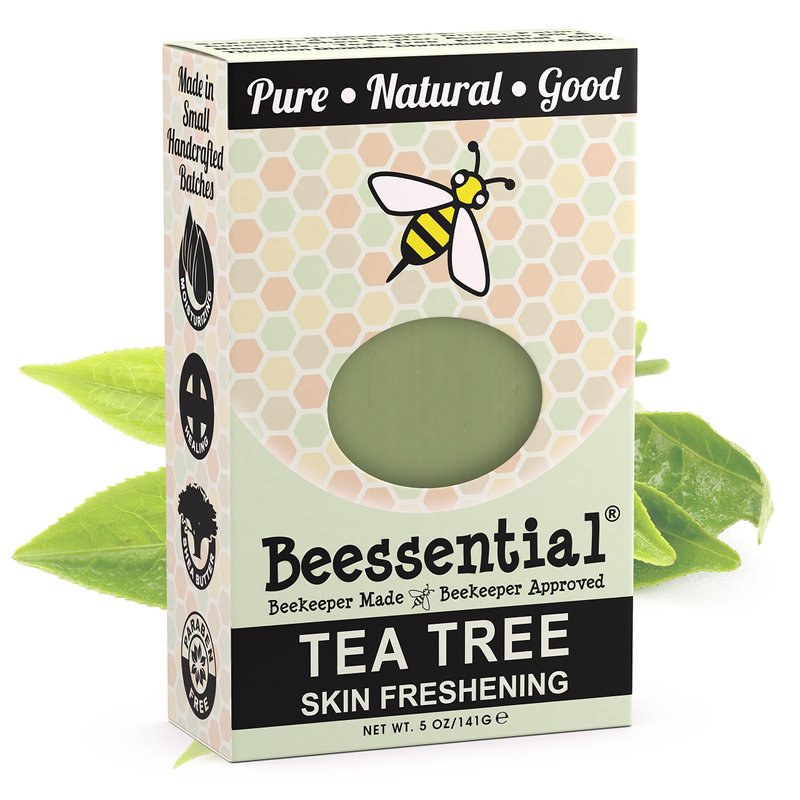 - Beessential Tea Tree Bar Soap is soothing and gentle on skin. This mildly camphor-scented natural soap offers relief for many common skin problems and can be used to treat Acne.