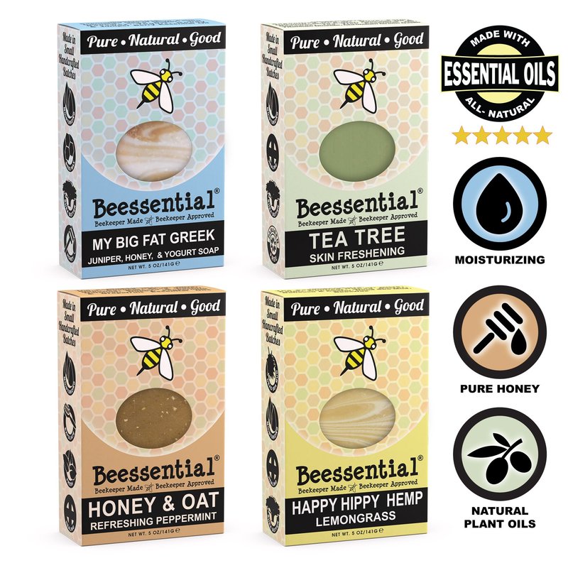 Beessential Natural Bar Soap, 4 Count Variety, with Moisturizing Beeswax, Shea Butter, Olive Oil (Peppermint, Honey & Yogurt, Tea Tree, Lemongrass) - Made in the USA, 5 oz