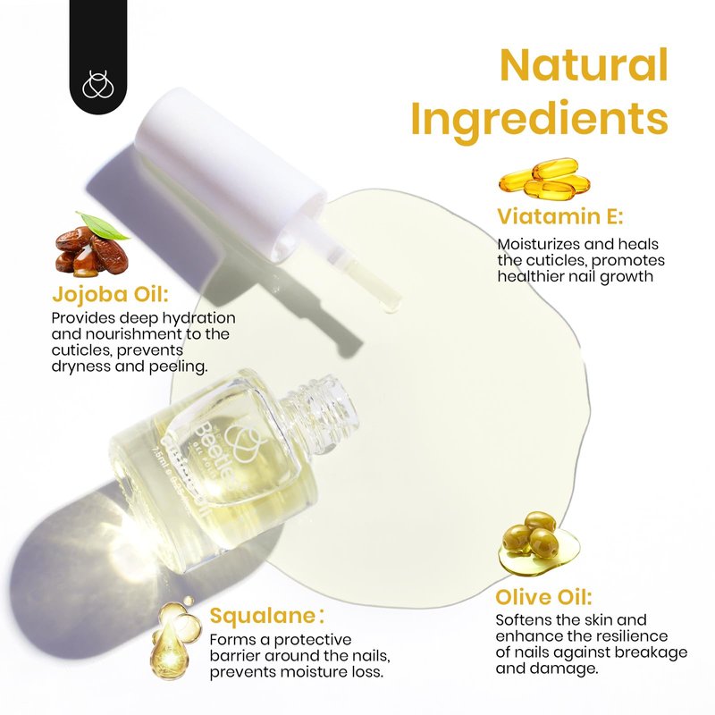 - Natural Ingredients: Nutritious & Healthy Nail CareBeetles cuticle oil contains real natural nutrient ingredients ( Jojoba Oil、Olive Oil、Vitamin E) that moisturize the cuticles and strengthen the nails.