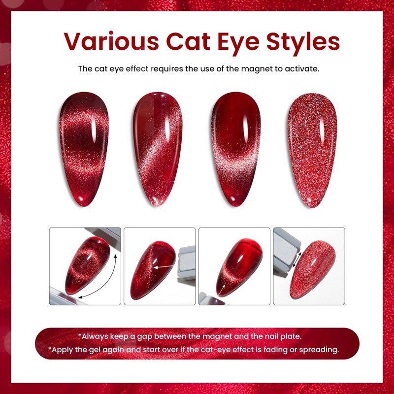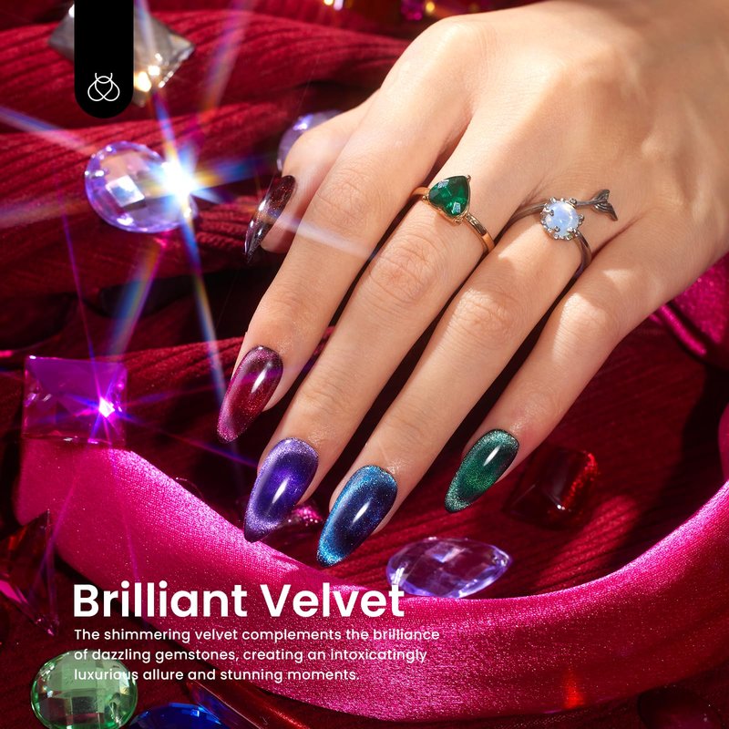 - 【2024 Limited Edition Color Cat Eye Gel】Annual Special "Brilliant Velvet Collection" gel nail polish set with a magnet: 6 fantastic interstellar colors of Cat eye gel to create galactic colors on your nails - Red, Shiny Brown, Burgundy, Purple, Blue, Green, Chocolate.Tips: Place the magnetic stick over the surface about 3-5mm for 5-10 secs to get your desired effect!